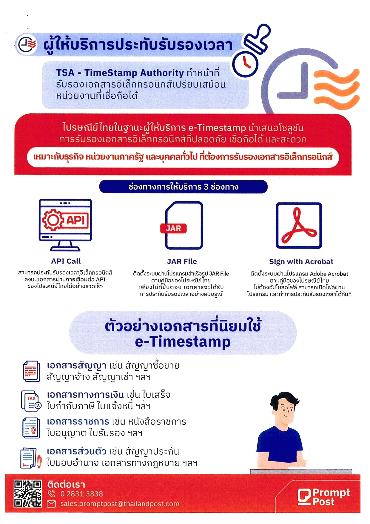 บริษัท ไปรษณีย์ไทย จำกัด ขอเชิญชวนให้ทดลองใช้บริการ e-Timestamp โดยเป็นการประทับรับรองวันและเวลาของเอกสารที่ลงประทับ ณ เวลานั้น และมีข้อมูลตามที่รับรองไว้บนเอกสารอิเล็กทรอนิกส์ เพื่อสร้างความเชื่อมั่น โดยไม่มีค่าใช่จ่ายเป็นระยะเวลานาน 2 เดือน